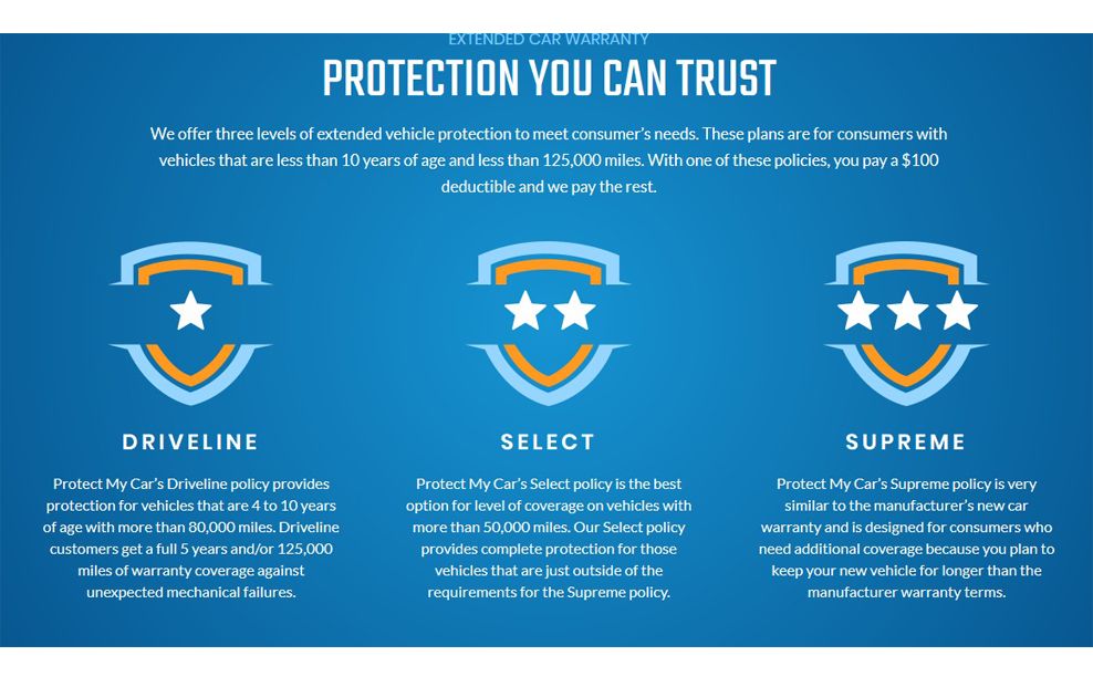 Protect My Car sells three extended car warranties for used vehicles and cars with an expired manufacturer warranty. The available coverages and reimbursement policies are average, and the vehicle restrictions are limited to cars under 125,000 miles. While PMC is a big name in the car warranty industry, the quote process and customer service did not instill trust in me as I evaluated the service.