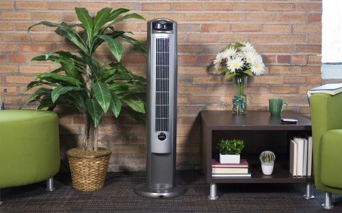 This tower fan oscillates up to 90 degrees, which is a good range for covering a whole room. In addition, you get its ionizer that can help reduce the allergens in the air. It also is equipped with three variable speeds and a timer to help you keep the power bill down. The timer is flexible, allowing you to set it from 30 minutes to 7.5 hours. If you tend to get cold in the middle of the night, this is a nice feature that saves you the trouble of waking up to turn off the fan. One problem with this fan is it can be difficult to clean the fan blades. You’ll have to take it apart to do that.